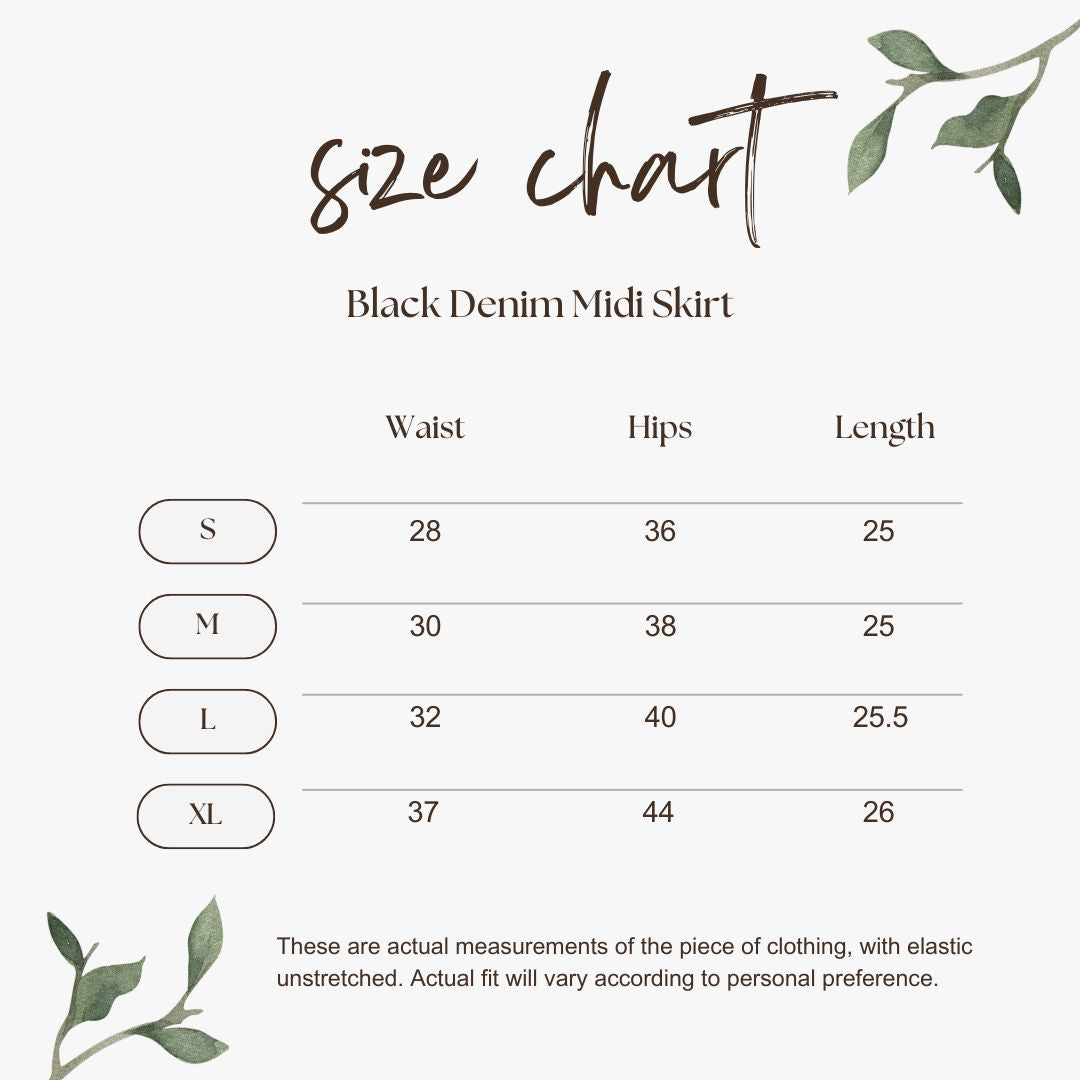 A timeless black denim midi skirt crafted for everyday versatility. The length hits just below the knees and functional pockets provide practical storage. This skirt is a staple for every closet!