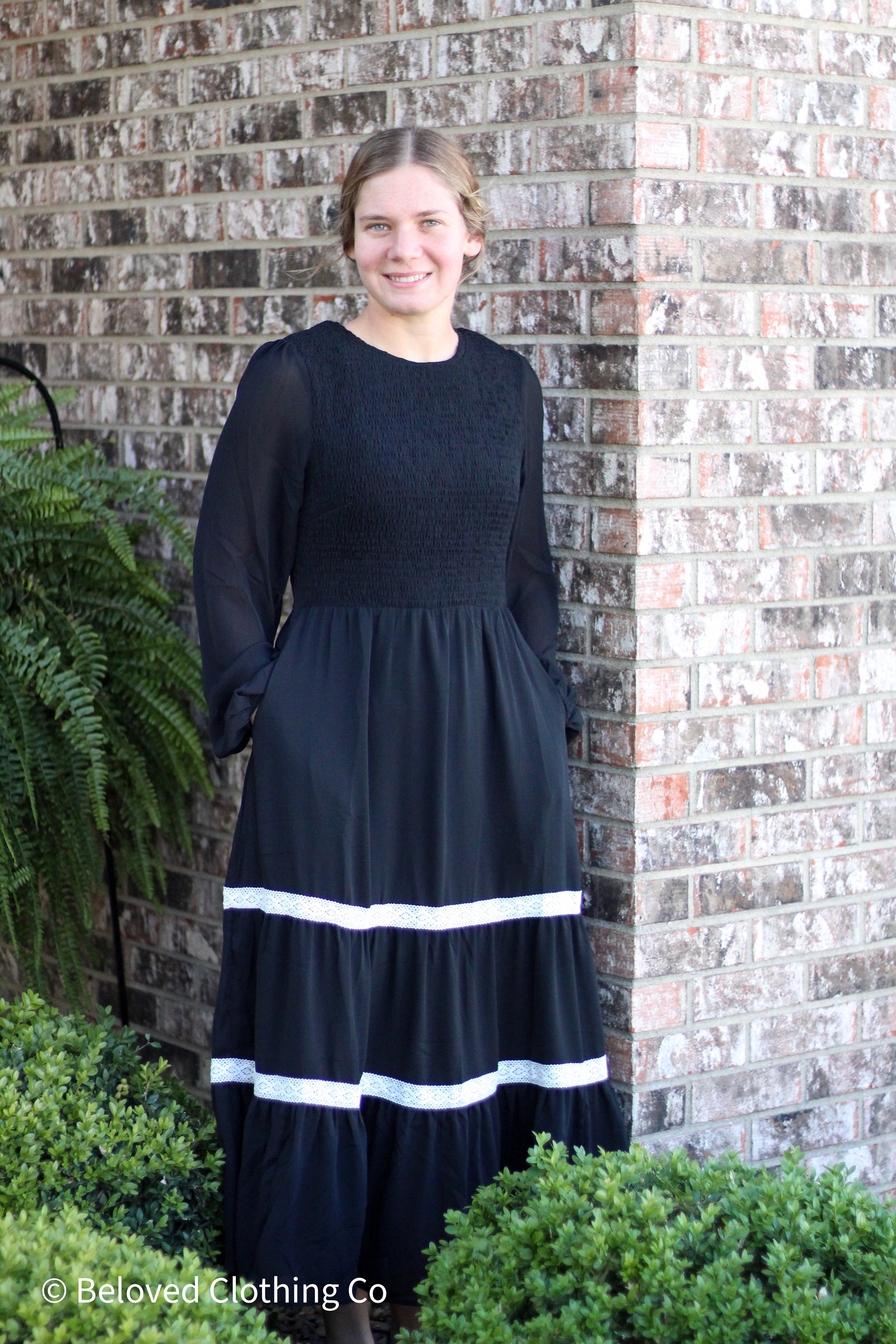 Elevate your style with our Black Tiered Lace Trim Midi Dress. Made with intricate lace trim detailing, this dress adds a touch of sophistication to any occasion. The tiered design and midi length provide a flattering silhouette, making you feel confident and beautiful. Perfect for your next special event.