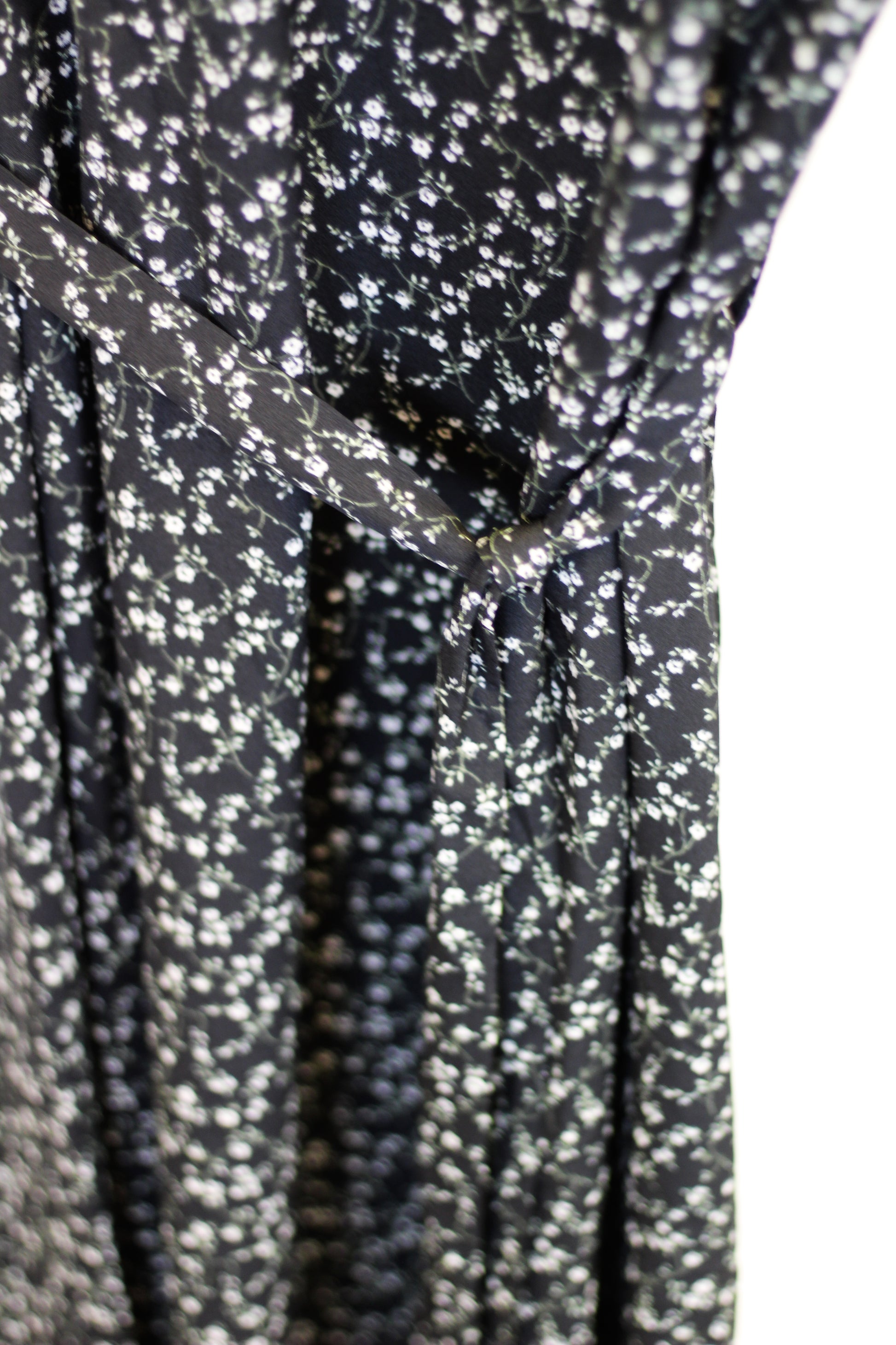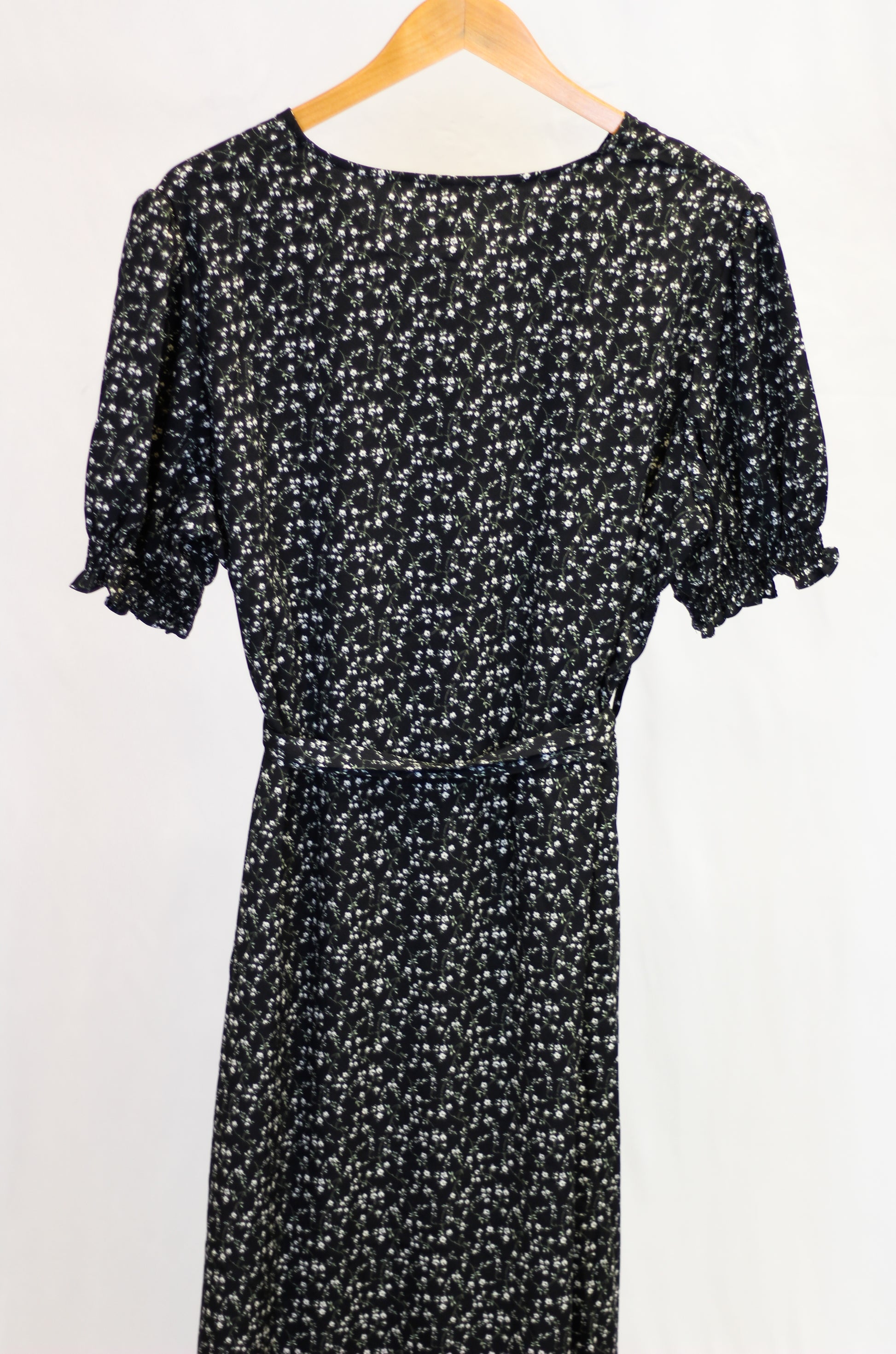 Add a touch of feminine charm to your wardrobe with our Floral Print Tie Midi Dress. The classic black and floral print makes it a versatile piece for any occasion. The tie waist creates a flattering silhouette, making you feel confident and pretty.