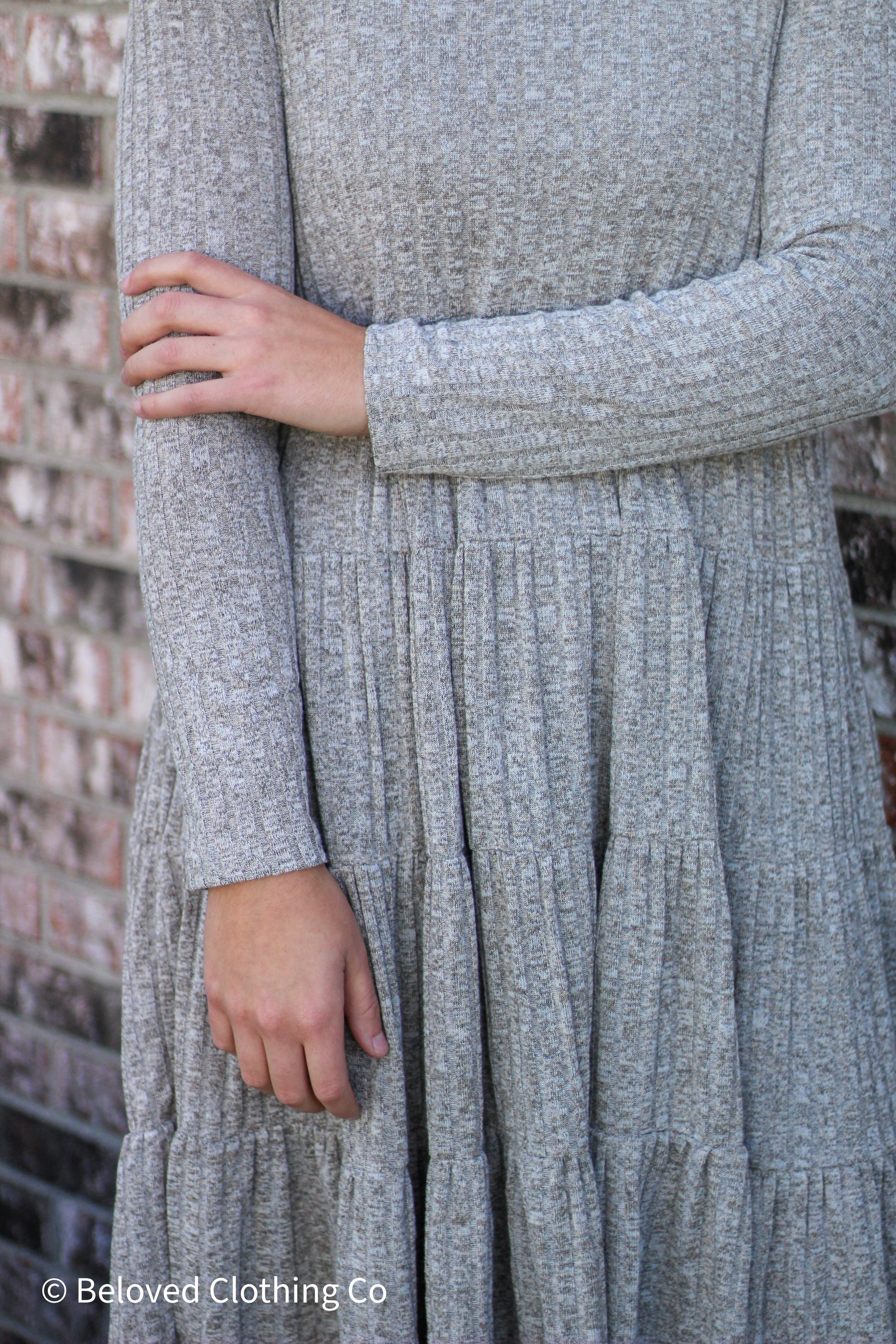 Stay cozy and stylish in our Ribbed Long Sleeve Sweater Tiered Midi Dress. With its soft ribbed material and long sleeves, this dress will keep you warm while its tiered design adds a flattering touch. Perfect for any occasion, this dress is a must-have for your wardrobe.