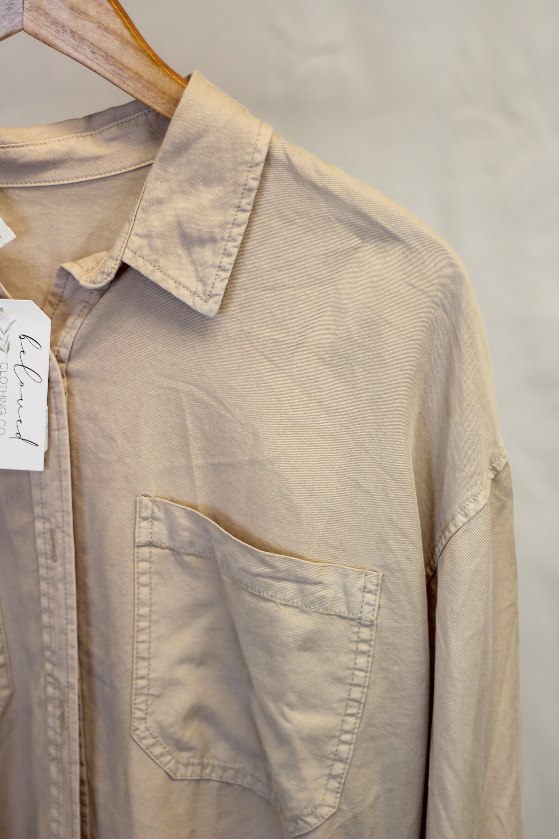 The Soft Wash Tencel Oversized Shirt is the ultimate combination of comfort and style. Made with soft-washed Tencel, this shirt is incredibly soft to the touch and drapes beautifully on the body. The oversized fit and roll cuffs add a casual touch, while the button down closure and chest pockets provide practicality. Hits below the hip for a flattering silhouette. Crafted from 100% Tencel, this shirt is not only stylish but also sustainable.