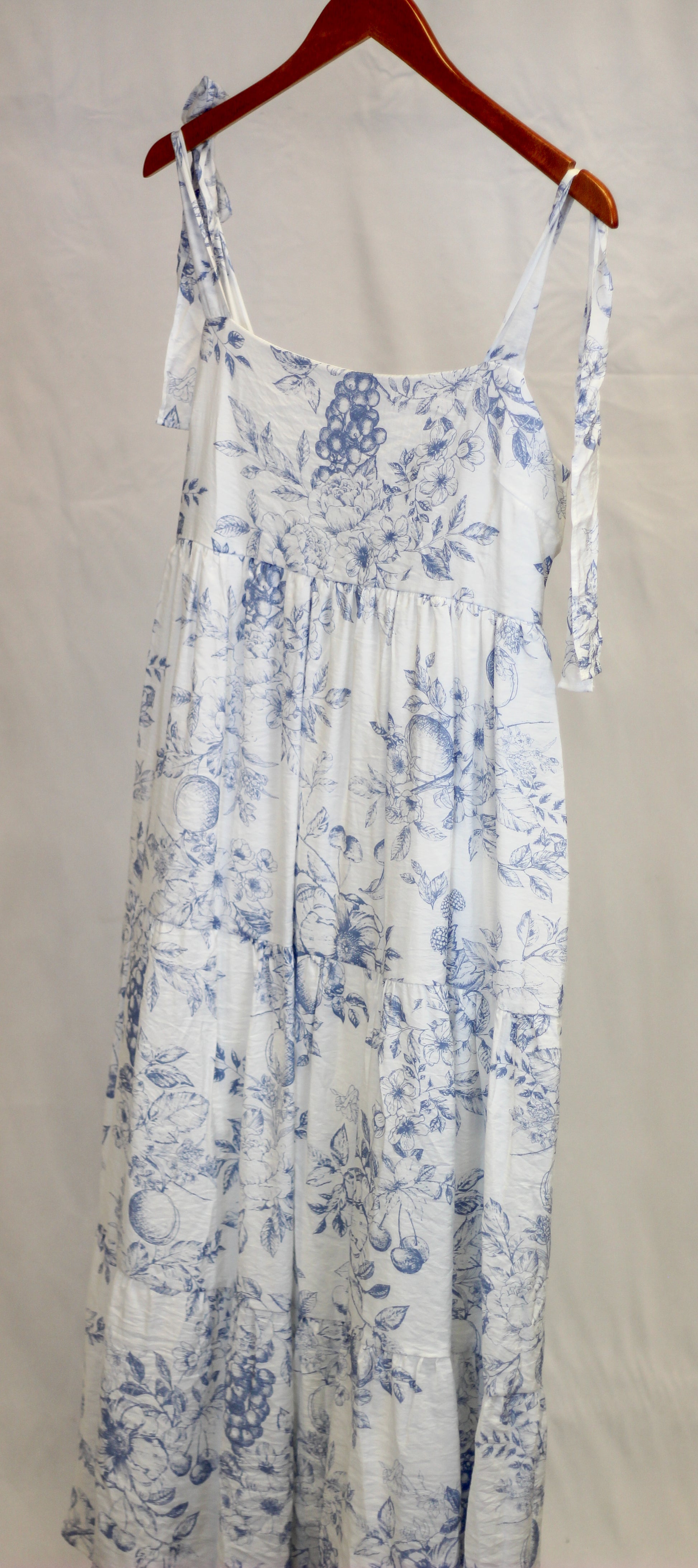 The Vintage Fruit Blossom Tiered Dress features a comfortable elasticized back tunnel and back smocking, along with a flattering square neckline and ribbon tie straps. This lined midi dress showcases a beautiful fruit blossom pattern and is made with a soft blend of rayon and nylon. Perfect for any occasion.